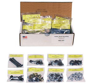 Each kit contains fasteners for fenders, hood and hinges, hood latch & catch, hood latch support, horns, headlamp buckets, headlamp doors, grille emblem, radiator, p/s oil cooler, shock brackets, cowl braces, shocks, heater, starter solnoid, junction block, voltage regulator, washer nozzles, wiring straps, battery hod-down, and other items as required per year of Shelby.