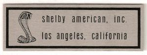 Aluminum plate that reads "SHELBY AMERICAN INC. Los Angeles, Calif." Covers FORD Logo. Price each.