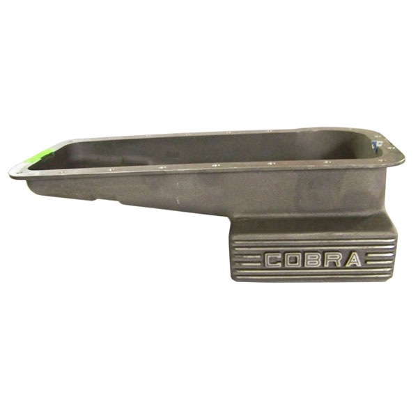 T-shaped, finned and COBRA lettered aluminum pan. Natural finish 6 1/2 qt capacity, complete with baffles. Looks neat on Cobras, Mustangs, Shelbys, Torinos, Streetrods, etc. Fits Ford 390-428 engines.