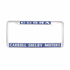 Chrome license plate frame with COBRA at top and Carroll Shelby Motors at bottom; Chrome letters on blue background.